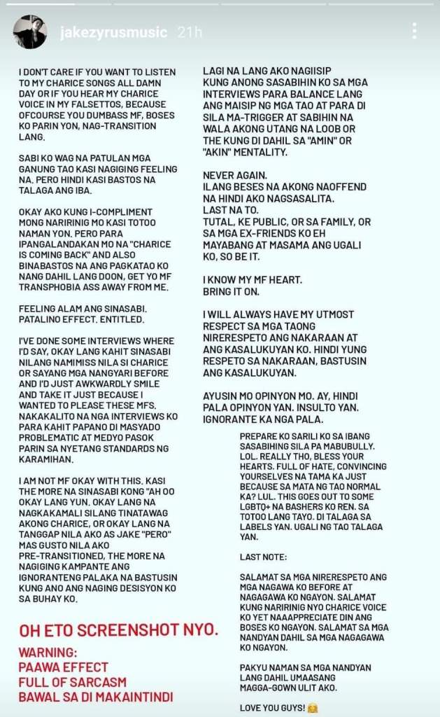 “I am not MF okay with this. Kasi the more na sinasabi kong “ah oo okay lang yun. Okay lang na nagkakamali silang tinatawag akong charice. Or okay lang na tanggap nila ako as Jake ”pero“ mas gusto nila ako pre-transitioned, the more na nagiging kampante ang ignoranteng palaka na bastusin kung ano ang naging desisyon ko sa buhay ko.â€